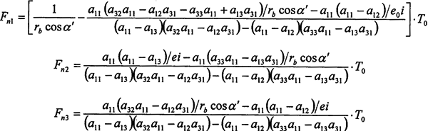 求解曲柄軸(2-24)、(2-25)和輸出軸(2-10)組成的關于嚙合力的方程組,可解得:
