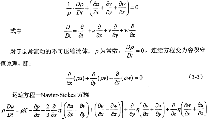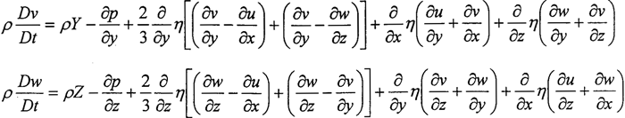式中u,v,w——分別為沿坐標x, y,z方向的流速;X,Y,Z——體積力分量;p——密度;η——粘度;t——時間。