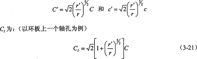 上式是按滑動軸承理論進行的,與我們設計的油膜浮動裝置有重要區別。我們設計的油膜浮動均載方案,共有兩層油膜,即:偏心套與浮環、浮環與滾動軸承之間各形成一層共轉滑動軸承油膜,設浮環內外半徑為r、r′,c、c′為浮環的內外半徑間隙,C1為環板的浮動量,由摩擦學理論可導出共轉軸承的浮動量C′和半徑間隙c′與普通滑動軸承的浮動量C和半徑間隙c之間的關系下:
