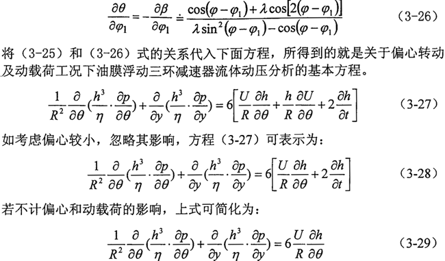 依據流體動力潤滑理論,首次建立了偏心轉動及動載工況下三環減速器油膜浮動的流體動力潤滑方程,為其動力學研究奠定了基礎。