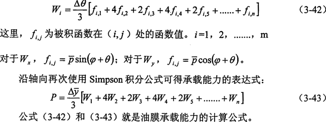 若液體壓力以解析表達式給出,油膜浮動的承載能力可由3-10和3-11式直接積分求得。但由于本節方法求出的壓力是離散值,其承載能力需用數值積分求解。本文通過采用Simpson 積分公式的方法,分別沿周向和軸向迭加求值。