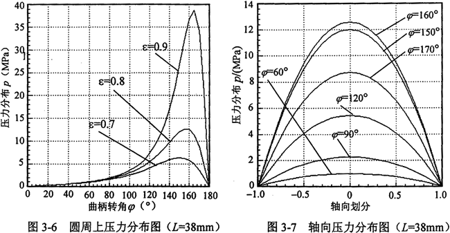 由圖3-7可看出,油膜浮動時的壓力沿軸向近似成拋物線形狀,但在不同的角度下其值則是不同的。