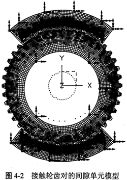 重慶大學(xué)機械傳動國家重點實驗室對三環(huán)減速器的內(nèi)齒環(huán)板所做的應(yīng)力分析以及對少齒差內(nèi)嚙合齒輪輪齒接觸問題研究均表明,三環(huán)減速器是多齒嚙合的。根據(jù)有關(guān)理論,筆者所在的課題組對完全平衡三環(huán)減速器的輪齒應(yīng)力和多齒嚙合問題進(jìn)行了理論計算和實驗研究,結(jié)果表明,三環(huán)傳動由于嚙合過程中的輪齒受力變形形成了多齒接觸,各齒上的載荷分布近似0°~180°間的正弦關(guān)系。圖4-2所示是接觸輪齒對的間隙單元模型。