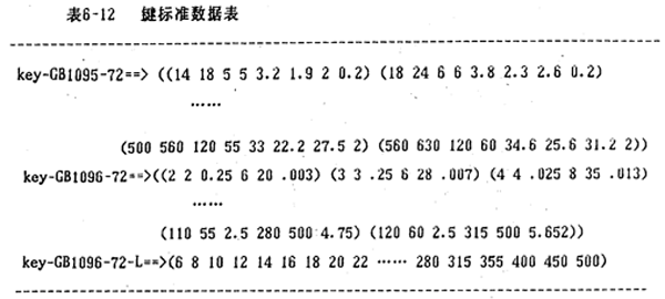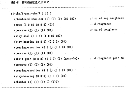 軸的結(jié)構(gòu)通常為階梯軸,階梯的級(jí)數(shù)以及各階梯的直徑和長度,應(yīng)綜合考慮軸上零件和裝配固定形式,軸的加工工藝性等因素進(jìn)行設(shè)計(jì),階梯數(shù)以易于安裝,同時(shí)減少加工次數(shù)為主要原則。通過大量統(tǒng)計(jì)分析分類,系統(tǒng)采用七種軸的結(jié)構(gòu)形式,分別用框架表示。表6-8其中一類軸的定義形式。其中,表中主要內(nèi)容:12為段數(shù),chatnfered-shoulder、…,nose、…分別為軸段特性、尺寸、加工特性等,第九行中的shaft-gear為連軸式齒輪,最后一列的gear-No為該齒輪的編號(hào),可以作為索引查詢到該齒輪的參數(shù)。在確定尺寸時(shí),某類軸的形式有時(shí)會(huì)發(fā)生變化。例如,階梯軸某一段長度為零時(shí),這一階梯軸段便在設(shè)計(jì)圖紙上消失。