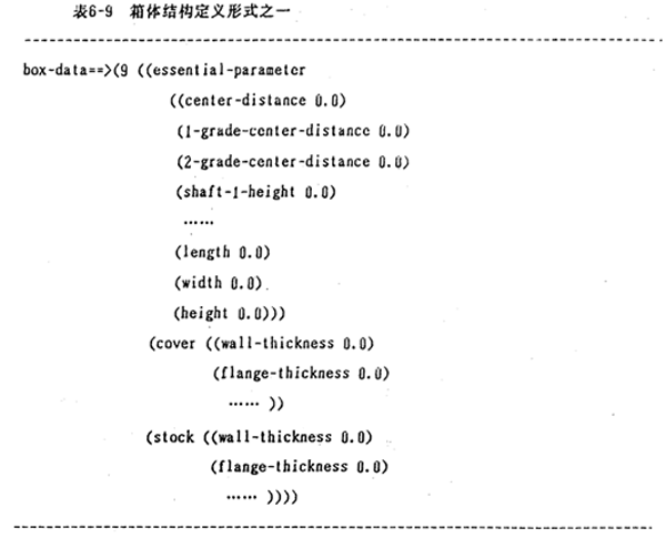 在進(jìn)行圖1-1、圖1-2-1、l-2-2、1-2-3種類的圓柱齒輪減速器設(shè)計(jì)時(shí),箱體是種類最多,變化程度最大的部件,因此,不可能建立一種統(tǒng)一的模式。根據(jù)傳動(dòng)方案的不同,箱體形狀會(huì)發(fā)生很大的變化,設(shè)計(jì)工作量極繁重。通過分析,本系統(tǒng)采用的方法是通過框架來表達(dá)箱體設(shè)計(jì)的大量知識(shí),如表6-11所示的框架是圖1-2-2 中第9號(hào)箱體的結(jié)構(gòu)定義式。
