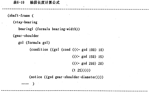 箱體結(jié)構(gòu)及尺寸設(shè)計(jì)完成后,便可進(jìn)行傳動(dòng)軸結(jié)構(gòu)參數(shù)長度的設(shè)計(jì)計(jì)算。軸的各段長度,決定于軸上零件的寬度,零件間的相對位置,傳動(dòng)布置,箱體尺寸以及安裝要求等。傳統(tǒng)的設(shè)計(jì)方法是根據(jù)草圖進(jìn)行設(shè)計(jì),專家系統(tǒng)則要求精確的數(shù)值計(jì)算。軸段長度的計(jì)算是通過其知識(shí)框架和嵌套在框架中的過程知識(shí)進(jìn)行,如表6-10所示。過程知識(shí)主要用于非規(guī)律性知識(shí)的求值。在計(jì)算時(shí),§6.8中定義的軸的結(jié)構(gòu)有時(shí)會(huì)發(fā)生變化,這主要表現(xiàn)在