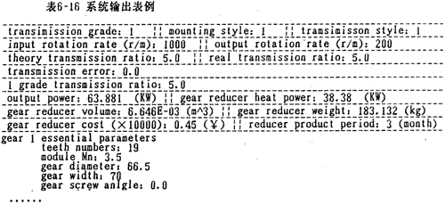 圓柱齒輪減速器設(shè)計(jì)完成后,其結(jié)果為一系列表(LISP 語言形式)組成的結(jié)果。為了使專家系統(tǒng)的結(jié)果方便地被用戶所理解,系統(tǒng)設(shè)置有相應(yīng)的輸出函數(shù),并以表格的形式,輸出所需的設(shè)計(jì)數(shù)據(jù)。下表(表6-16)為專家系統(tǒng)設(shè)計(jì)的一一級(jí)圓柱齒輪減速器的示例。