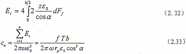 設內、外齒輪軸線間有一相對橫向振幅δ0,如圖2.10所示,則第i對齒面相對滑動的位移為δi=δ0/cosα,齒面滑動摩擦力為Ff=fT/rpncosα,其中f為齒面間的滑動摩擦系數,第i對齒對上的摩擦力消耗的能量為Ei=4Ffδi