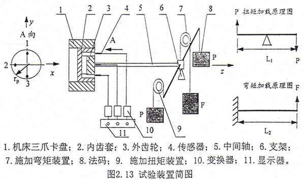 齒輪聯軸器的內齒套固定在一個三爪卡盤上,聯軸器的外齒輪插入內齒套與之相嚙合。采用3個電渦流傳感器,傳感器的布置見圖2.13,試驗臺的實拍照片見圖2.14。中間軸的一端與外齒輪固接,而另一端則用于施加扭矩和施加繞X方向的彎矩。扭矩和彎矩的大小由法碼的重量和桿或軸的長度來確定。作用于聯軸器上的扭矩