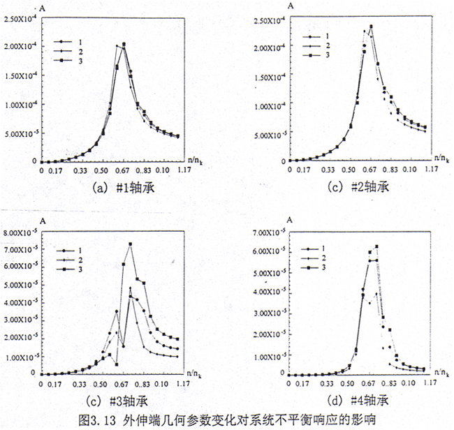 從上面的計算可見,在給定的條件下,轉子外伸端的幾何參數對在#1、#2軸承處的不平衡響應影響不大;對#3、#4軸承處的不平衡響應有影響,但量級較小,因此可以認為外伸端的幾何尺寸對系統的不平衡響應影響較小。