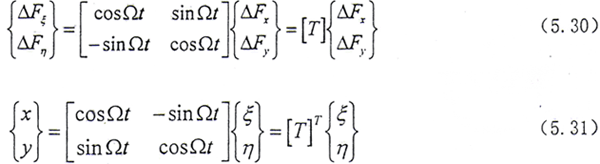 通過上述過程,得到了半聯(lián)軸器系統(tǒng)的運(yùn)動(dòng)微分方程,再與其他各結(jié)點(diǎn)的運(yùn)動(dòng)方程集合在一起,就得到轉(zhuǎn)子—齒輪聯(lián)軸器系統(tǒng)的運(yùn)動(dòng)方程。然而,對(duì)于旋轉(zhuǎn)機(jī)械,在轉(zhuǎn)子的某處總存在著軸承,即形成軸承—轉(zhuǎn)子—齒輪聯(lián)軸器系統(tǒng),這樣就需要引入支承條件,具體的做法是只要在轉(zhuǎn)子—齒輪聯(lián)軸器系統(tǒng)上具有軸承支承的自由度處用廣義力(即軸承油膜力)來反映支承的影響。以滑動(dòng)軸承為例,經(jīng)過線性化處理后的油膜力在固定坐標(biāo)系中可表示為