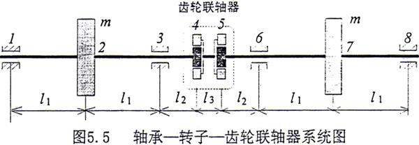 以上我們建立了半聯軸器系統的運動方程,而在實際系統中往往是由二對內外齒輪同時嚙合傳動(例如CL和CLZ型齒輪聯軸器),軸承—轉子—齒輪聯軸器系統如圖5.5所示。