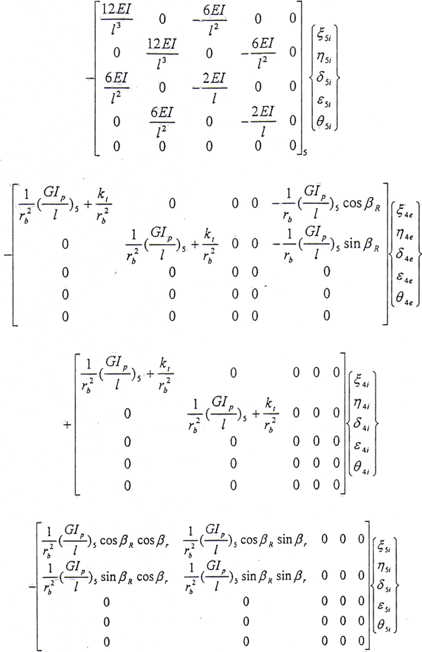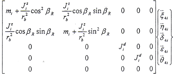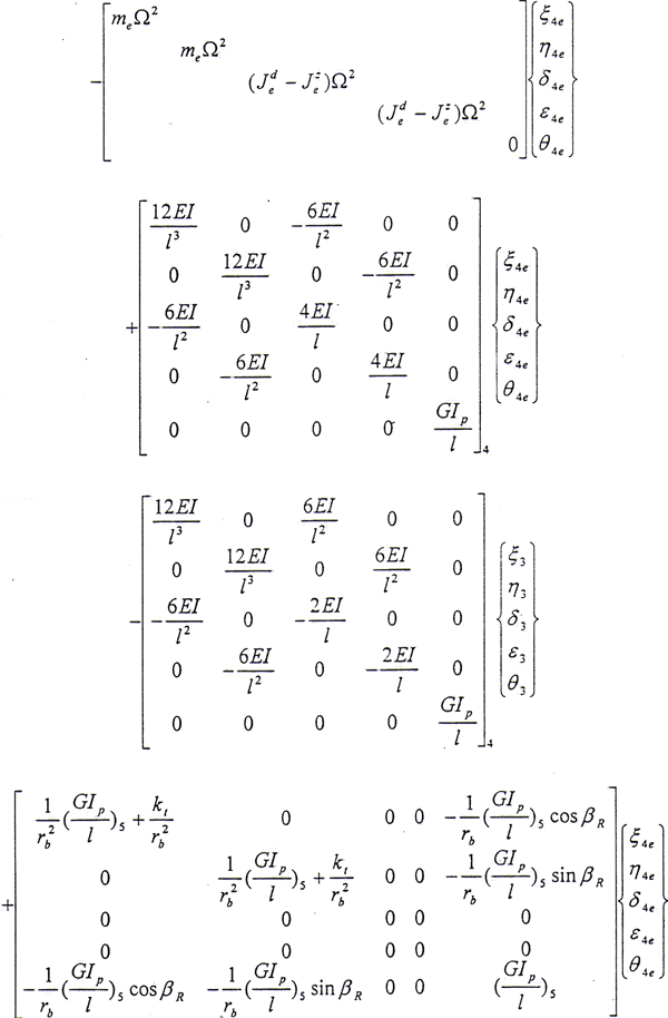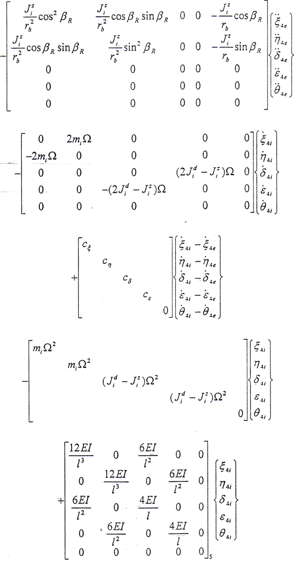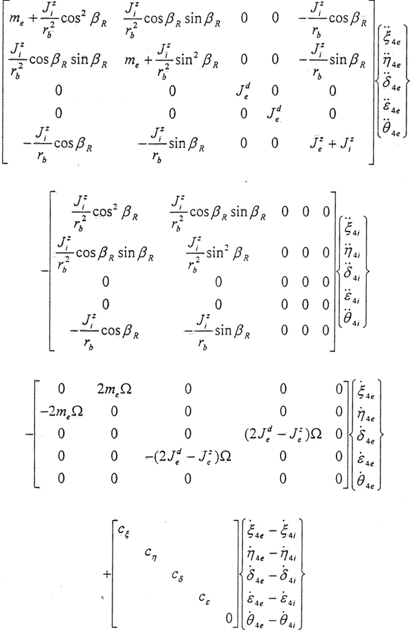 在式(5.27)和式(5.28)中,由于包含了θj+1(即為圖5.5中的θ5i)。而θ5i又必須要滿足以上的約束關系,所以可以想象在考慮了二個半聯軸器后,耦合關系更為復雜。但處理的方法是類同的,具體過程在此不再重復了。整個系統有8個結點,共48個自由度。下面僅列出結點4處的運動微分方程。
