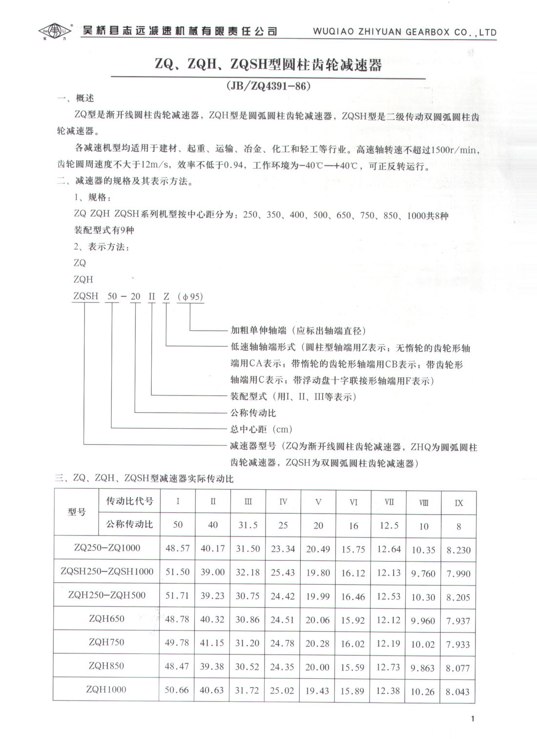![]() ZQ,ZQH,ZQSH型齒輪減速機 產品規格ZQ250減速機,ZQ350減速機,ZQ400減速機,ZQ500減速機,ZQ650減速機 發布時間2014-09-17 產品分類ZQ,ZQH,ZQSH型簡單介紹ZQ減速機為漸開線圓柱齒輪減速機,ZQH減速機為圓弧齒圓柱齒輪減速器,ZQSH減速機為雙圓弧圓柱齒輪減速機。ZQ減速機型均適用于建材、起重、運輸、冶金、化工和輕工等行業。高速軸轉速不超過1500r/min,齒輪圓周速度不大于12m/s,效率不低于0.94,工作環境為-40℃—+40℃,可正反轉運行。