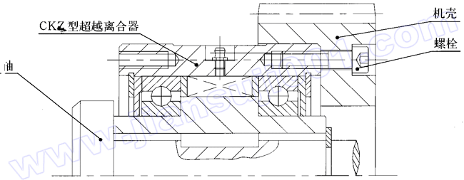 CKZ型為有軸承支撐的楔塊超越離合器。適用于極限轉速為600~1500r/min,常用公稱轉矩為:180~8000N·m,常用于包裝機、起重運輸機械、冶金機械、礦山機械、石油機械、化工機械、水泥機械、電站等,亦稱逆止器。此型號主要用于逆轉及雙動力源的慢速啟動裝置。