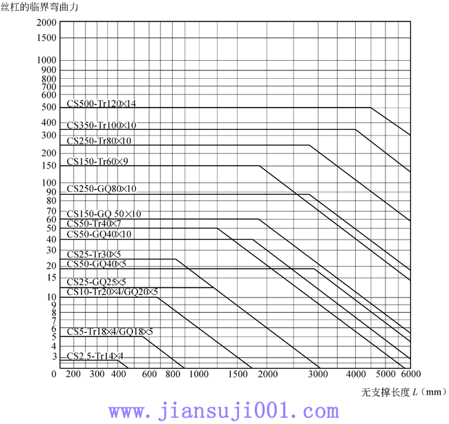 升降機要素之一的絲杠承受壓力時,梯形絲杠和滾珠絲杠的許用彎曲力可以用如下彎曲圖表校驗。